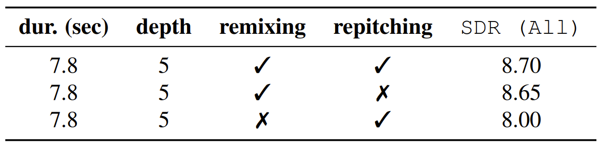 - 특히 remix augmentation은 제거했을 때 0.7dB의 SDR 저하를 보여 모델 학습에 중요한 요소라고 할 수 있음