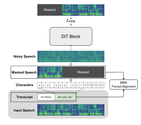 - F5-TTS는 Diffusion Transformer (DiT)를 활용한 fully flow-matching-based TTS model로써 OT-CFM 기반의 text-guided speech-infilling task를 통해 training 됨