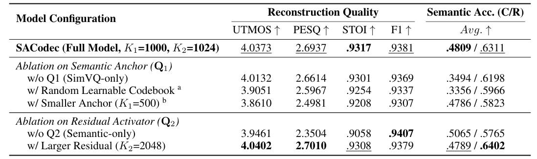 - Fixed, large-scale mHuBERT codebook을 활용한 semantic anchoring mechanism을 통해 strong semantic prior를 inject 하고 semantic layer의 codebook collapse를 방지