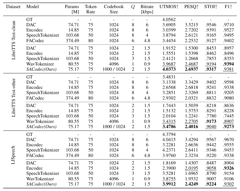 - Comparisons : DAC, EnCodec, SpeechTokenizer, WavTokenizer, FACodec