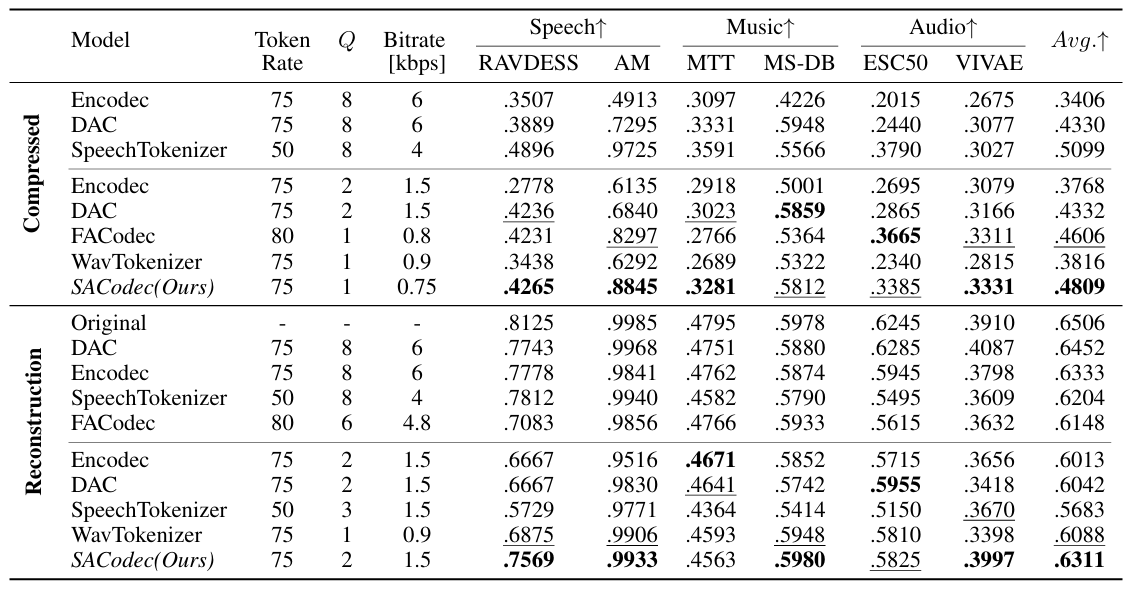 - 전체적으로 SACodec의 성능이 가장 우수함