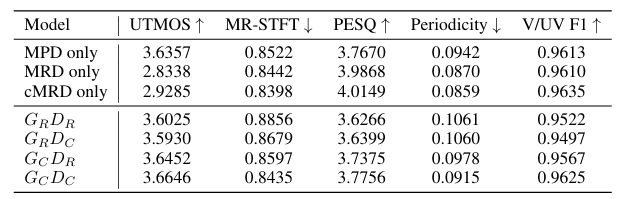 - Complex-valued generator, complex-valued discriminator $G_{C}D_{C}$ 조합을 사용할 때 최적의 성능을 달성함