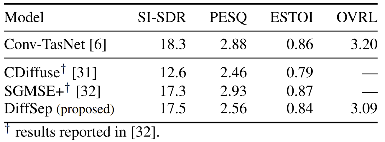 - SI-SDR, PESQ, STOI 측면에서는 DiffSep의 성능이 Conv-TasNet보다 낮게 측정됨