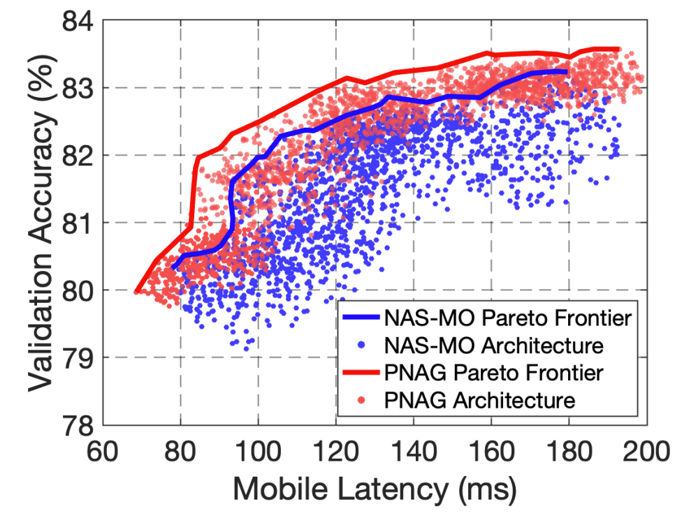 - Pareto-frontier를 비교해 보면, PNAG는 다양한 budget하에서 NAS-MO보다 더 나은 frontier를 찾을 수 있음