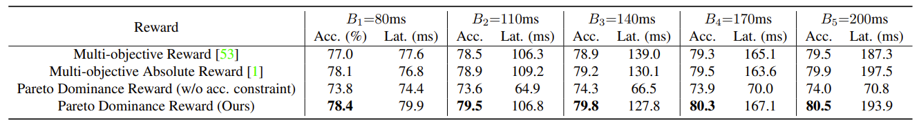 - Multi-objective reward와 비교했을 때, Pareto-dominance reward는 generator가 budget 제약을 만족하는 architecture를 생성하도록 함