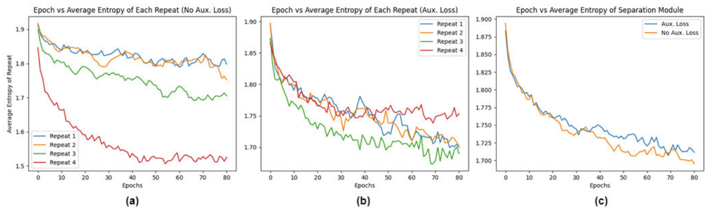- 전체 network에 대해 parameter 업데이트가 균형을 이루었다는 것을 의미 - (c) 전체 separation module에 대한 평균 entropy를 비교