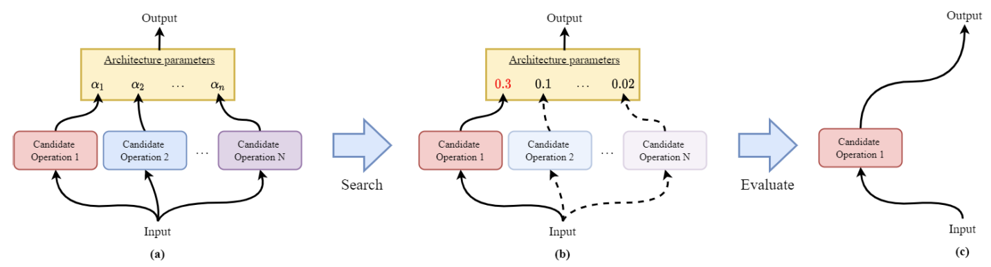 - Architecture parameter $\alpha_{i}$는 softmax를 사용하여 mixed operation에서 해당하는 candidate operation의 확률을 결정 - Over-parameterized network를 통해 DARTS는 model parameter $w$와 architecture parameter $\alpha$를 업데이트하여 architecture의 objective function을 최적화하는 bi-level optimization을 수행