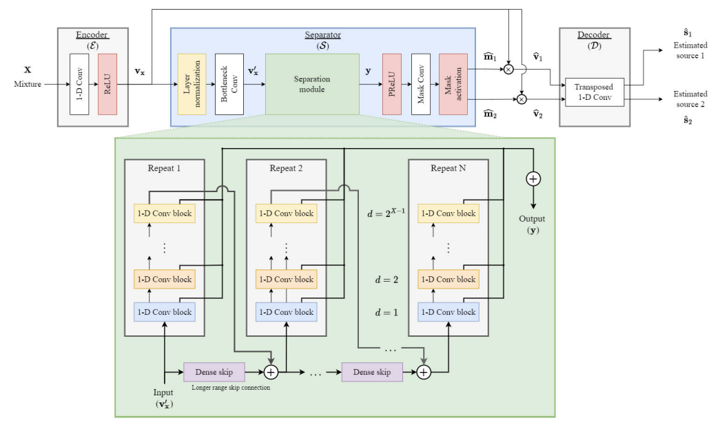 - Conv-TasNet은 Temporal Convolutional Network (TCN)을 활용하는 time-domain mask estimation separation 모델임