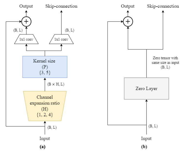 - Kernel size $\{3, 5 \}$와 expansion ratio $\{ \times 1, \times 2, \times 4 \}$를 가지는 1D convolution block 집합을 활용
