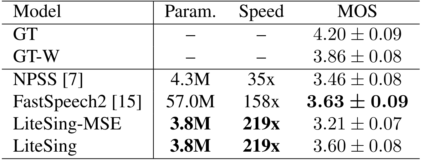 - Auto-regressive WaveNet을 활용하는 NPSS와 비교했을 때, LiteSing은 더 빠른 추론 속도와 합성 품질을 달성