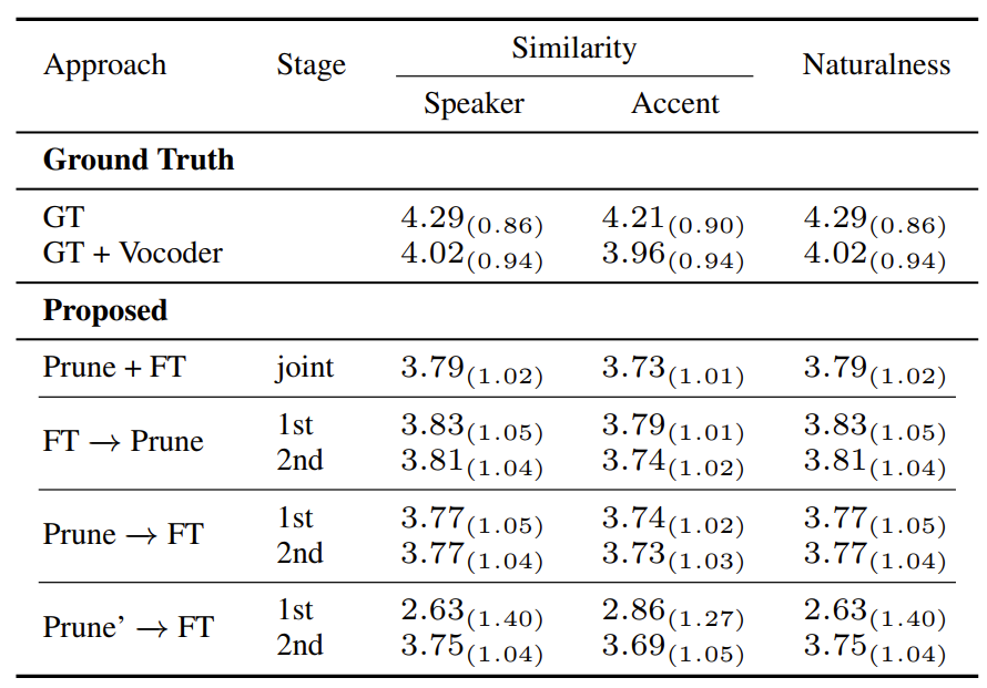 - 결과적으로 pruning 후 fine-tuning이 voice cloning을 위한 가장 안정적인 파이프라인