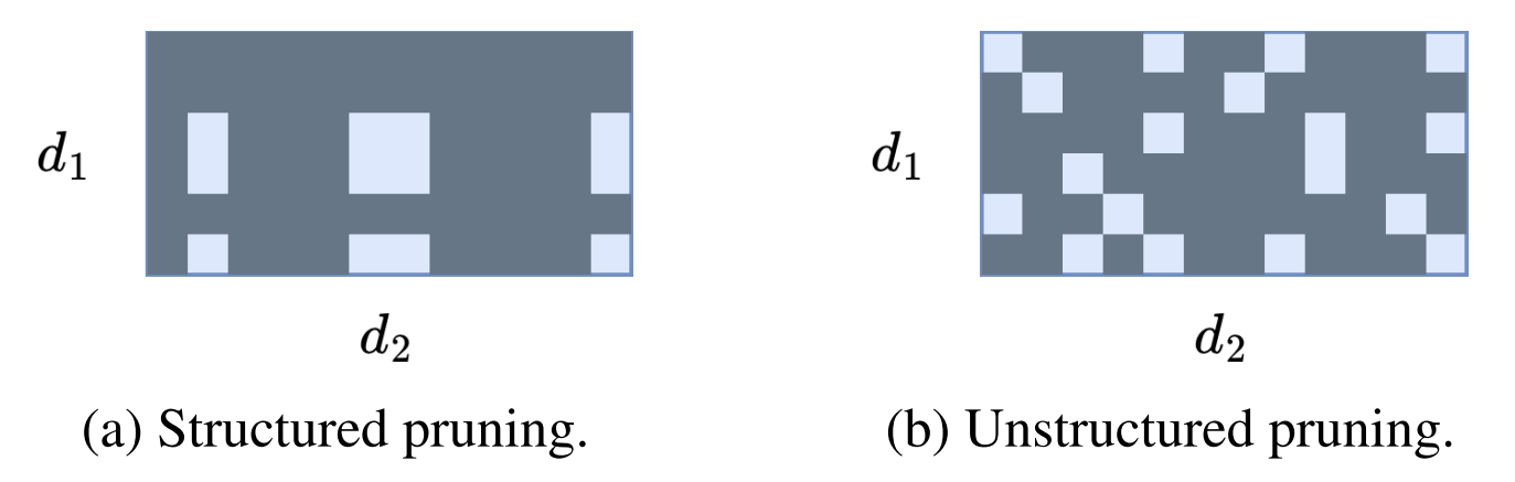 - 아래 그림과 같이 structured pruning은 prune 되지 않은 파란색 부분을 더 작은 matrix로 연결할 수 있기 때문