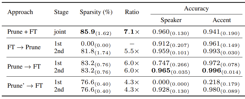 - FT : fine-tuning, Prune : pruning with voice-cloning data, Prune' : pruning with pre-training data