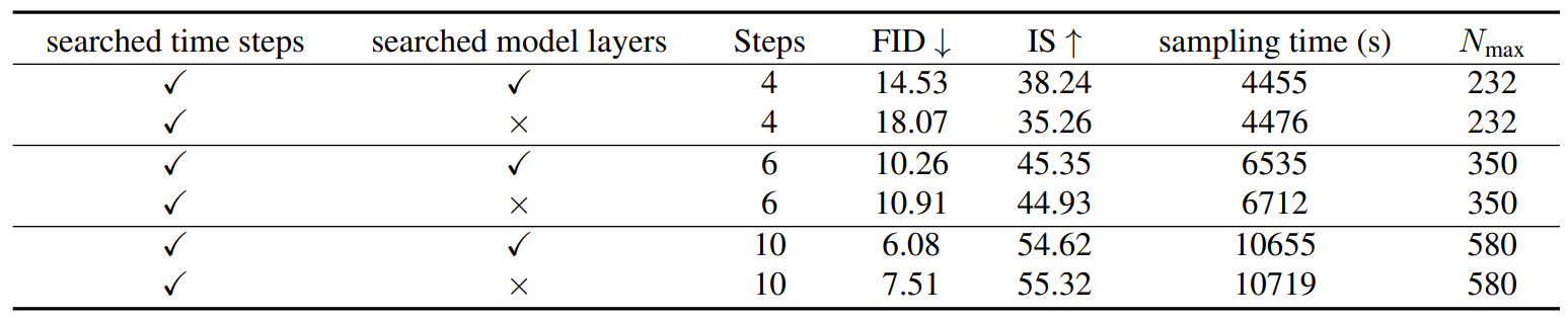 - AutoDiffusion을 time step과 model layer에 대해 함께 적용하면 성능을 더욱 향상할 수 있음
