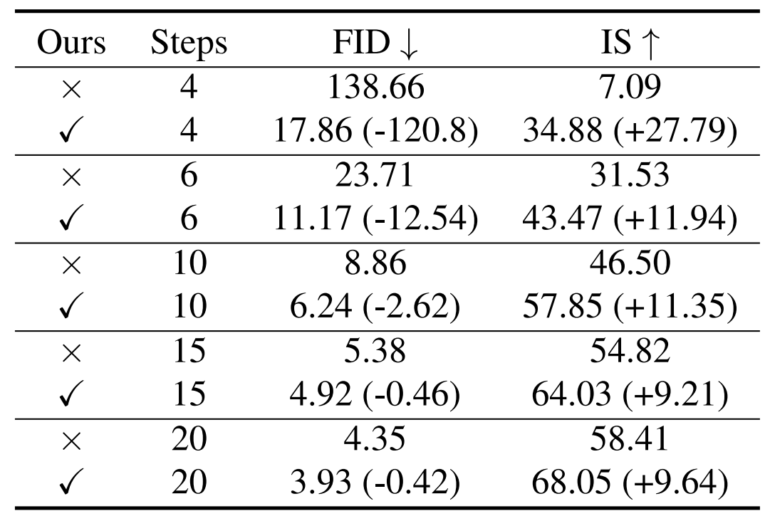 - 특히 AutoDiffusion을 적용하지 않았을 때에 비해 2배나 빠른 10-step 만에 최고 성능을 달성