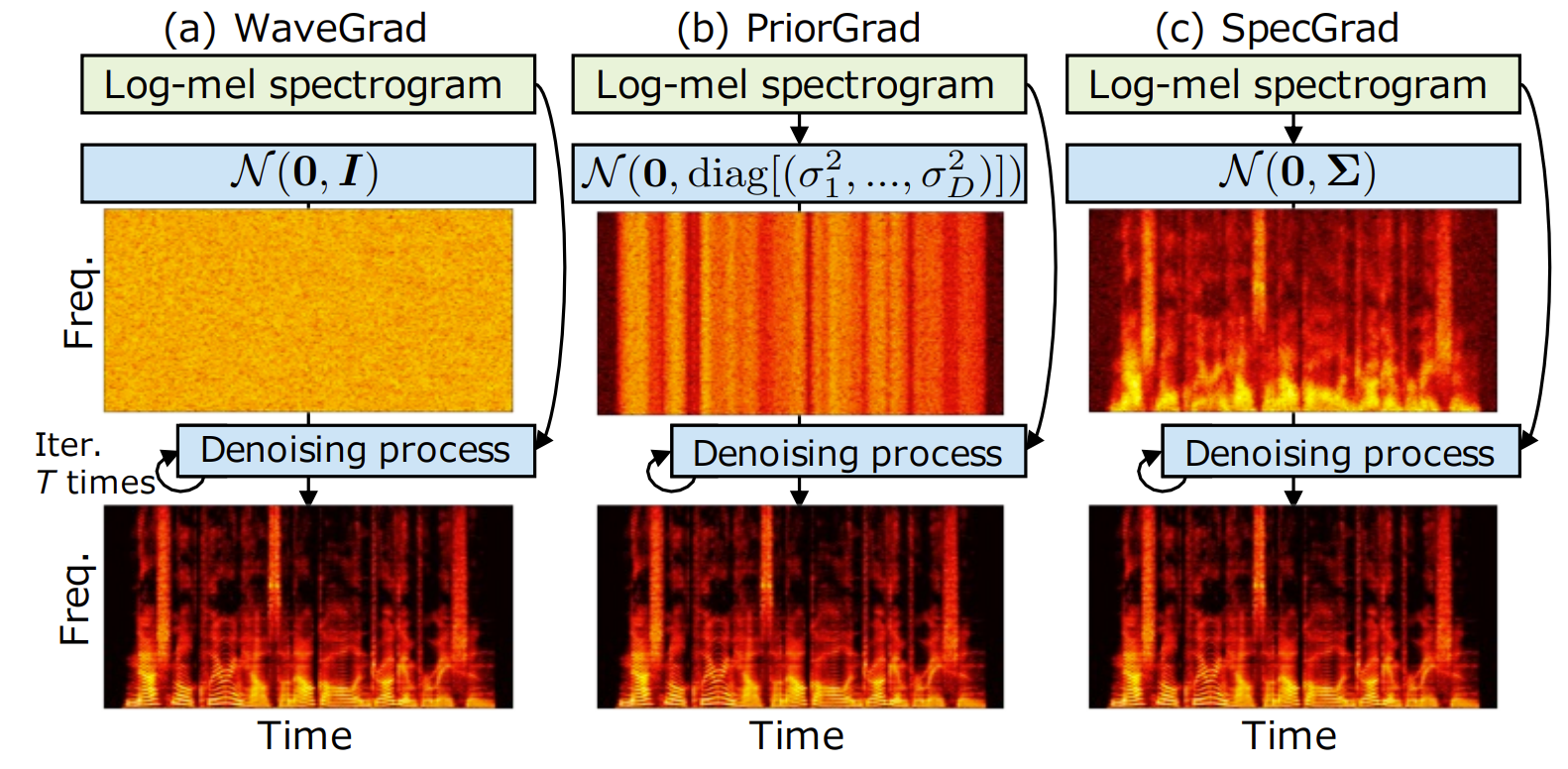 -> 그래서 conditioning log mel-spectrogram에 diffusion noise의 spectral envelope를 적합하는 SpecGrad를 제안