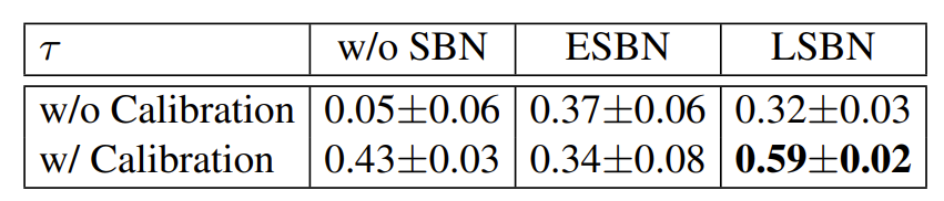 - Calibration이 적용된 Linear SBN (LSBN)은 가장 높은 $\tau$값을 보였지만, Exponential SBN (ESBN)에는 효과적이지 않은 것으로 나타남