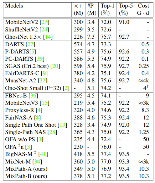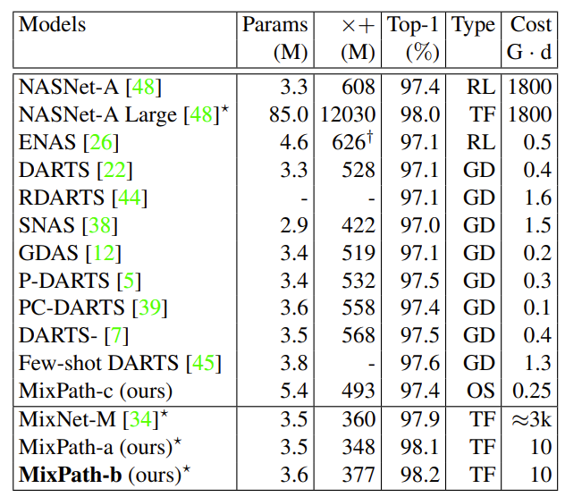 - Searched architecture인 MixPath-c는 493M FLOPs와 97.4%의 top-1 accuracy를 달성