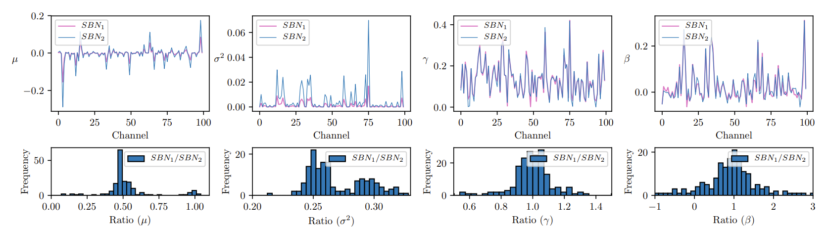 - 추가적으로 learnable parameter $\beta, \gamma$가 $SBN_{1}, SBN_{2}$와 상당히 유사함을 보임