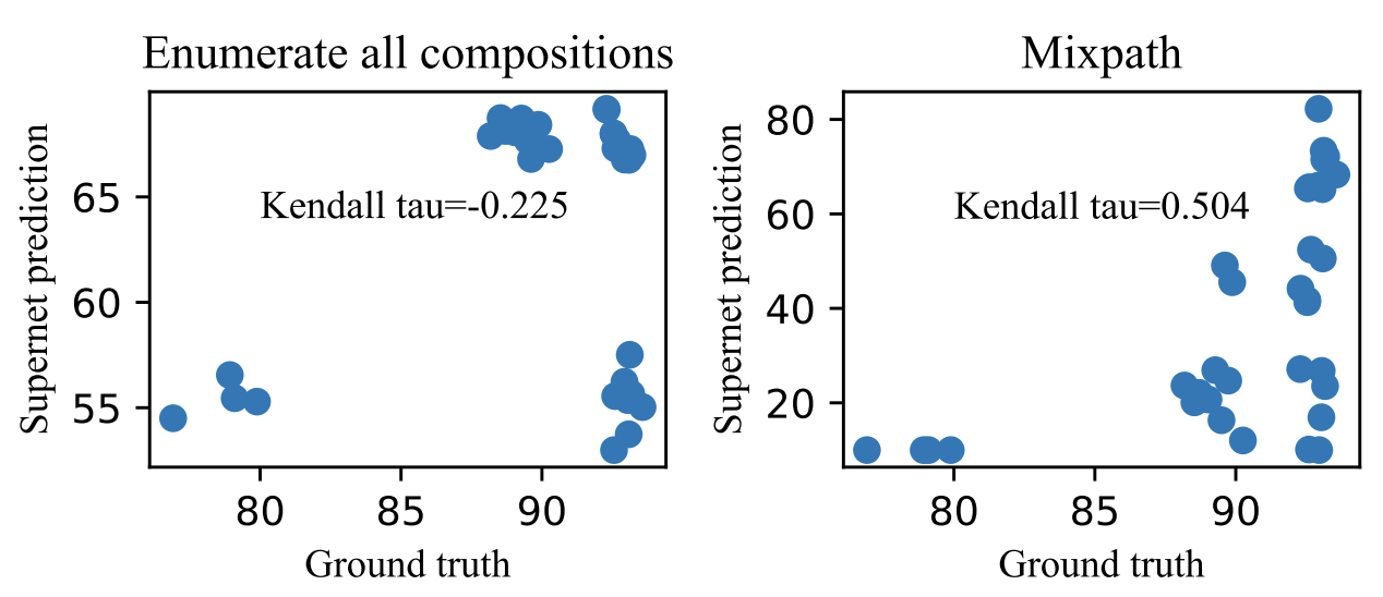 - 그에 비해 MixPath는 0.504의 Kendall Tau 값을 얻음 - 이는 SPOS는 MixPath supernet 보다 4배 더 많은 learnable parameter를 사용하기 때문 (199.7M vs. 52.9M)