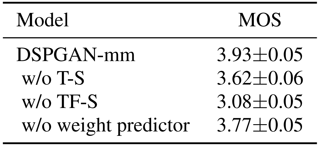 - DSPGAN에 대해 time-domain supervision, time-frequency domain supervision, weight predictor를 제거하여 합성 품질을 비교