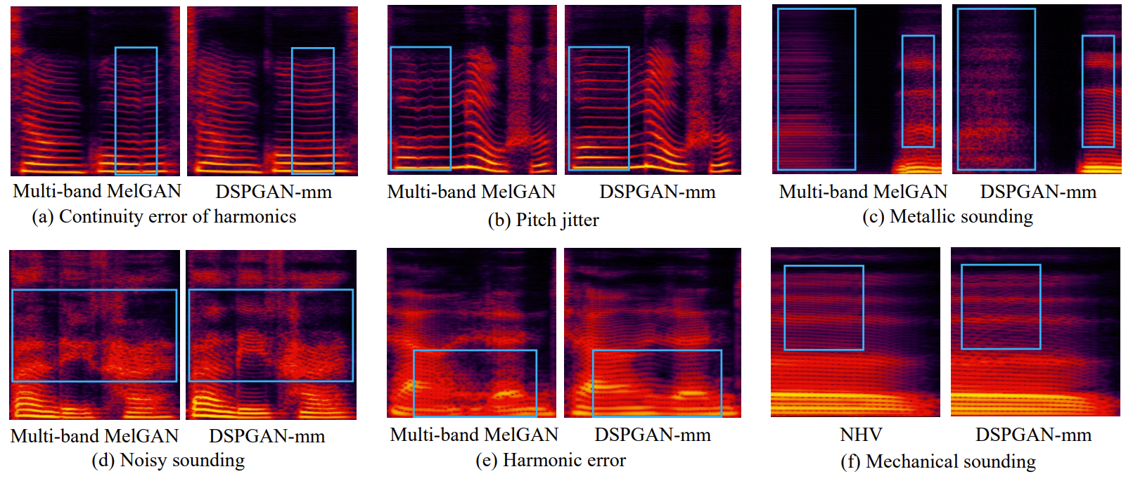 - (a), (b), (e) : DSPGAN은 sine excitation 도입을 통해 discontinuous harmonics, pitch jitter, harmonic error와 같은 artifact를 방지할 수 있음
