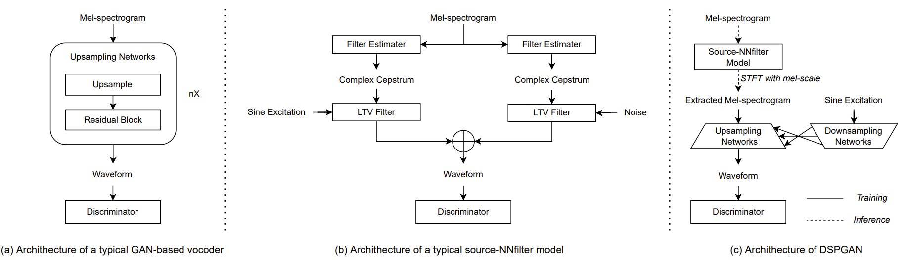 - 이를 위해 DSPGAN은 pre-trained source-NNFilter model에서 합성된 음성의 mel-spectrogram으로 기존의 mel-spectrogram을 대체