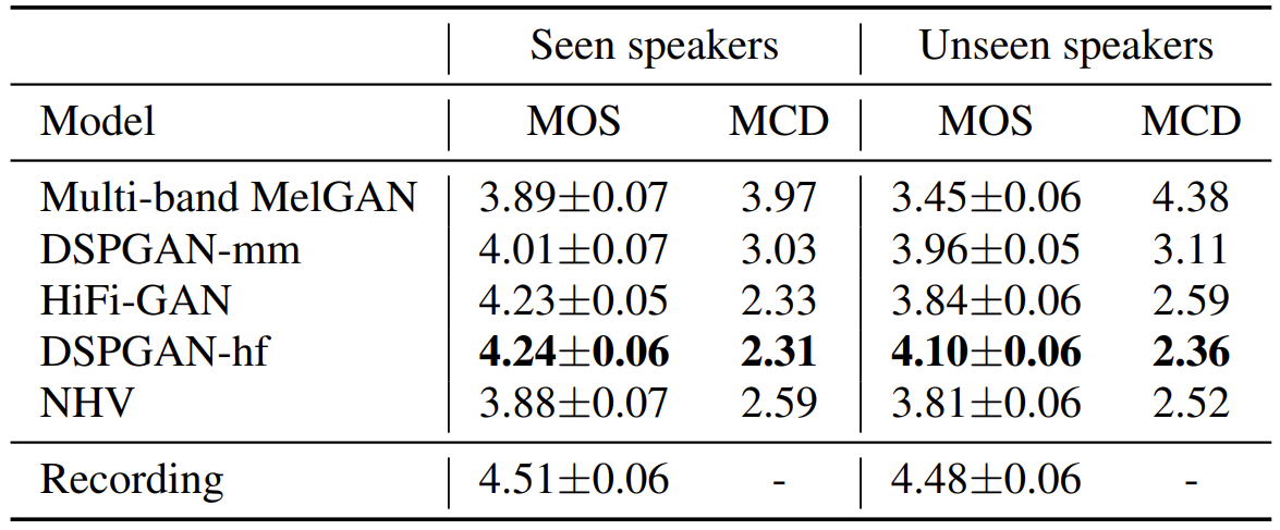 - DSPGAN의 경우 source-NNFilter model supervision을 통해 unseen speaker에 대해서도 robust 한 합성 품질을 보임