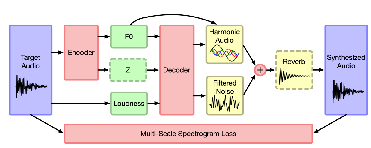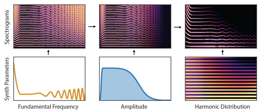 - Fundamental frequency의 harmonic (interger) 배수에서 sinusoids의 합으로 audio를 생성하고 이후 neural network는 time-varying parameter (fundamental frequency, amplitude, harmonic distribution)를 출력함