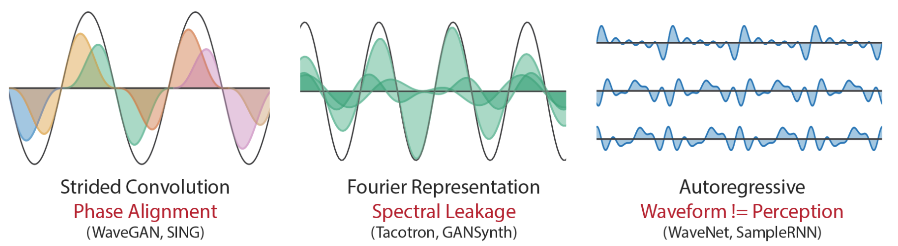 - 결과적으로 이를 위해 모델은 서로 다른 frame 간의 waveform을 align 하고 가능한 모든 phase variation을 cover 할 수 있는 filter를 학습해야 함 - Tacotron, GANSynth와 같은 Fourier-based 모델도 마찬가지로 STFT의 phase-alignment 문제를 겪음