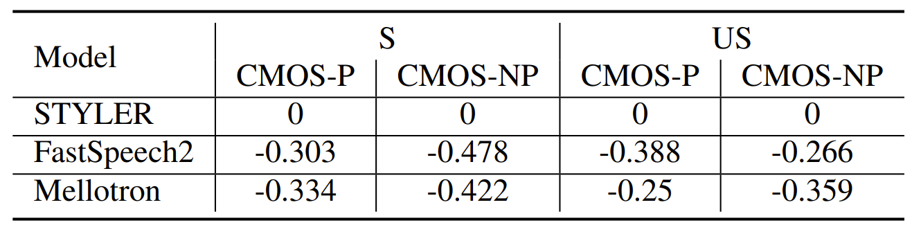 - STYLER는 CMOS 측면에서도 FastSpeech2, Mellotron 보다 더 나은 expressiveness를 보임