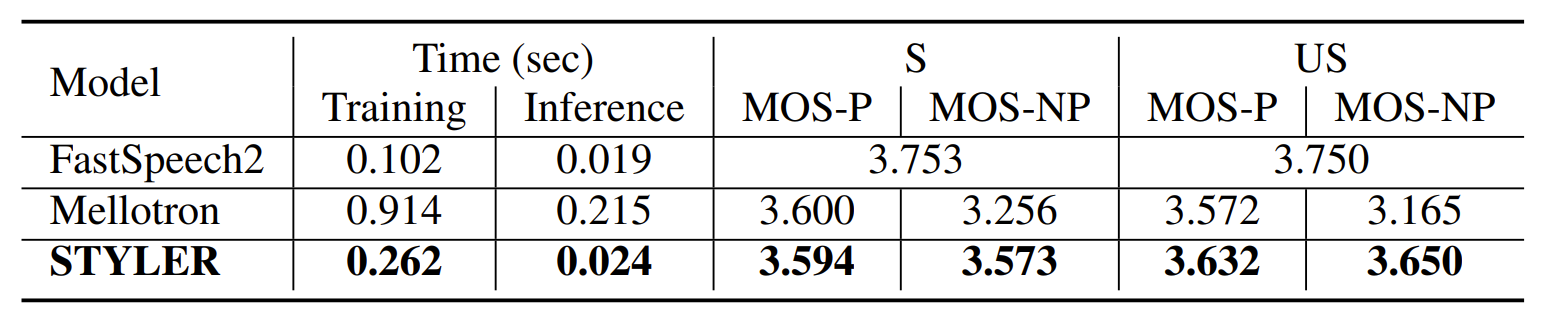 - STYLER는 style factor modeling으로 인해 FastSpeech2에 비해서는 다소 느린 속도를 보였지만, Mellotron에 비해 3.49배의 학습 속도와 8.96배의 추론 속도 향상을 보임