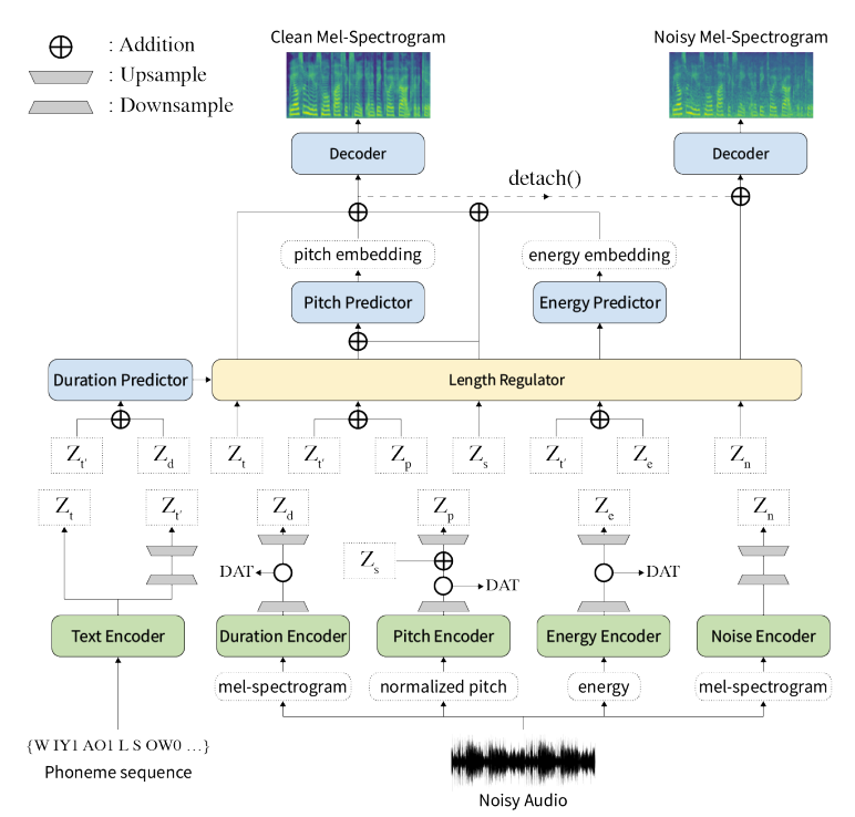 Noise encoder output을 noise-independent encoding에 추가하여 noise가 있는 mel-spectrogram을 예측