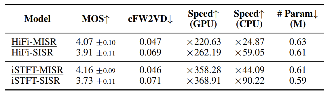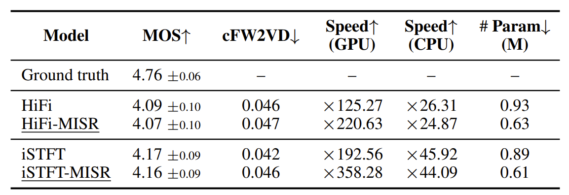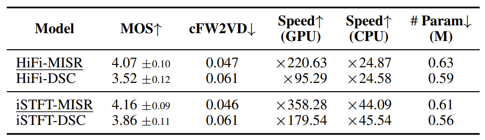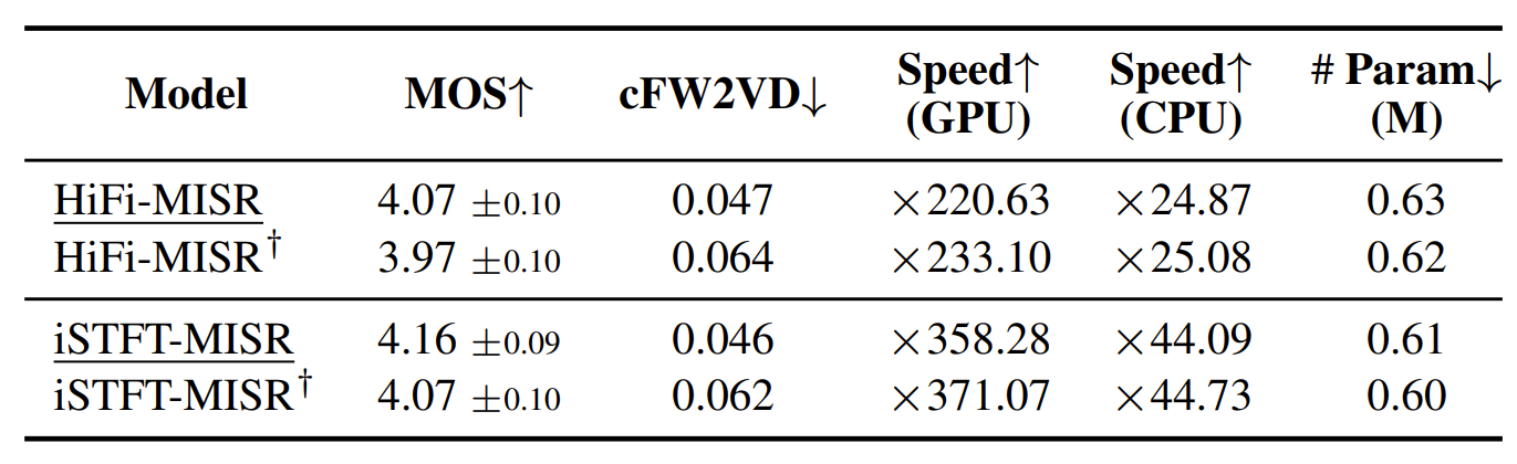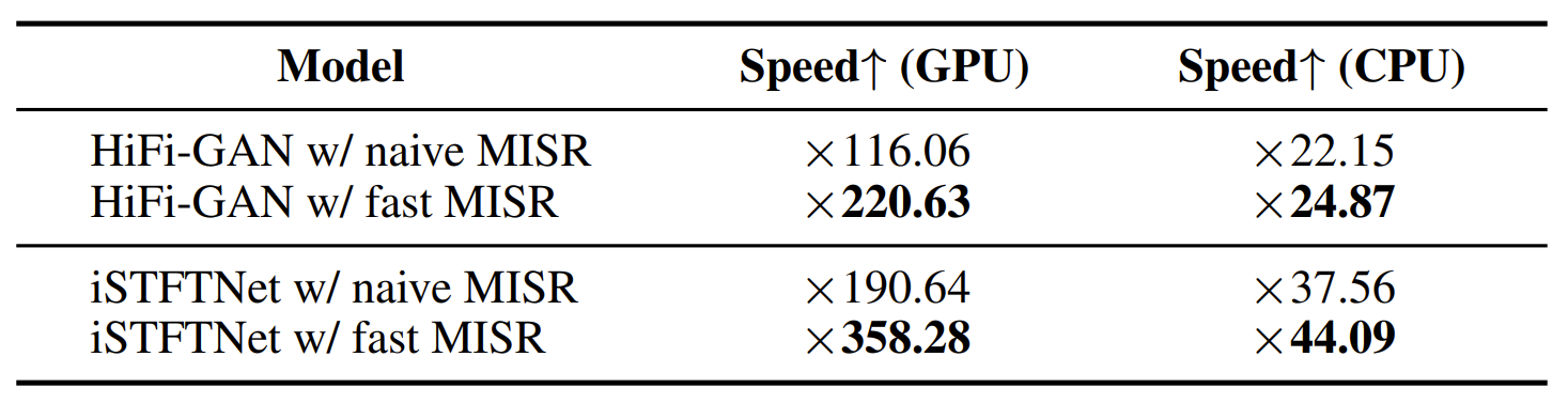 - 그에 비해 추론 속도 측면에서는 HiFi-MISR/iSTFT-MISR을 사용했을 때 상당한 개선이 이루어짐
