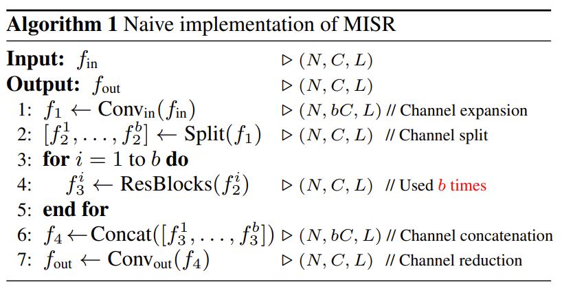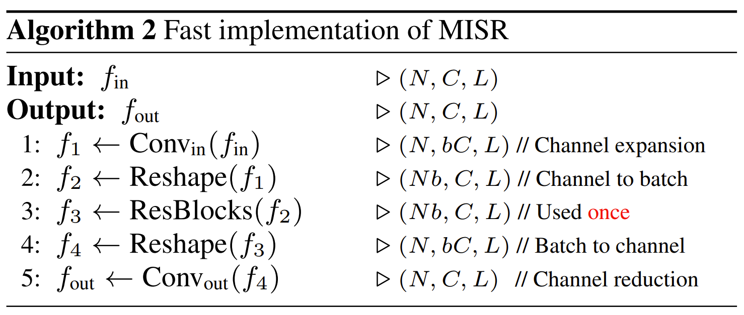 - Naive MISR에서 residual block은 for loop를 통해 $b$번 적용되므로 계산량이 증가됨 (Line 4)