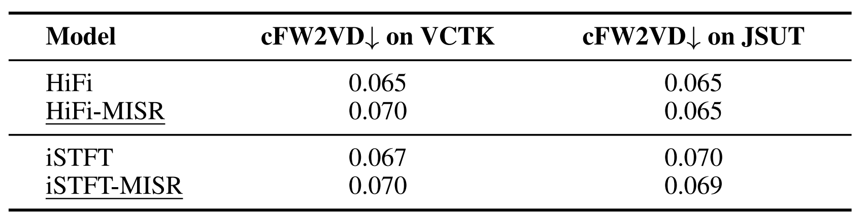 - MISR을 적용하더라도 기존의 HiFi-GAN/iSTFTNet의 합성 품질을 크게 저하시키지 않는 것으로 나타남